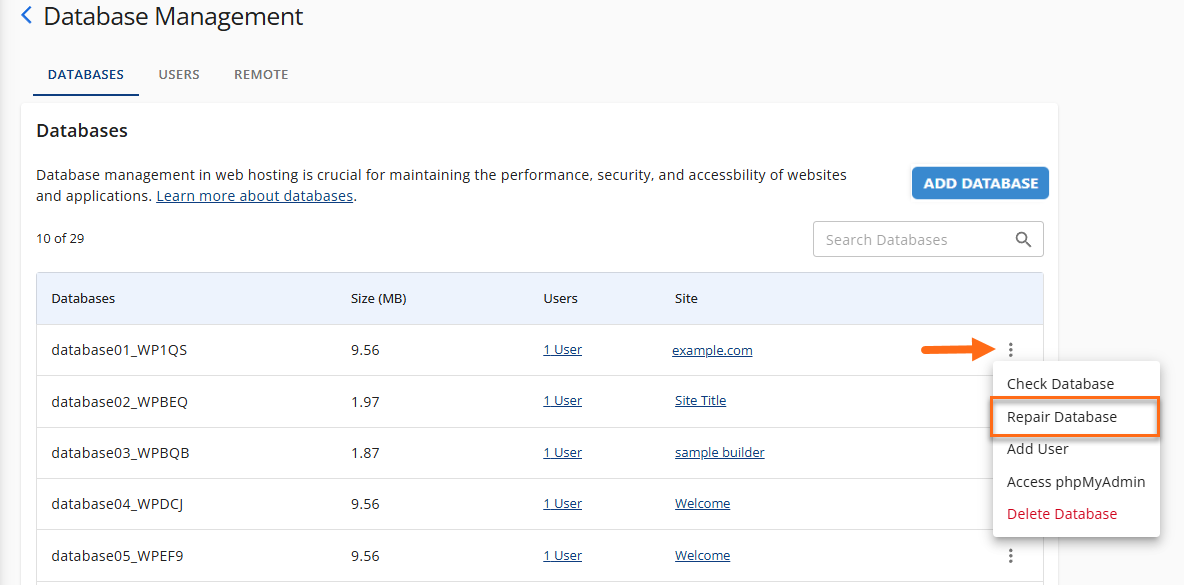 - 找到与您的网站关联的数据库。点击 竖排省略号图标(三个竖点) 并选择 ‘修复数据库’。
