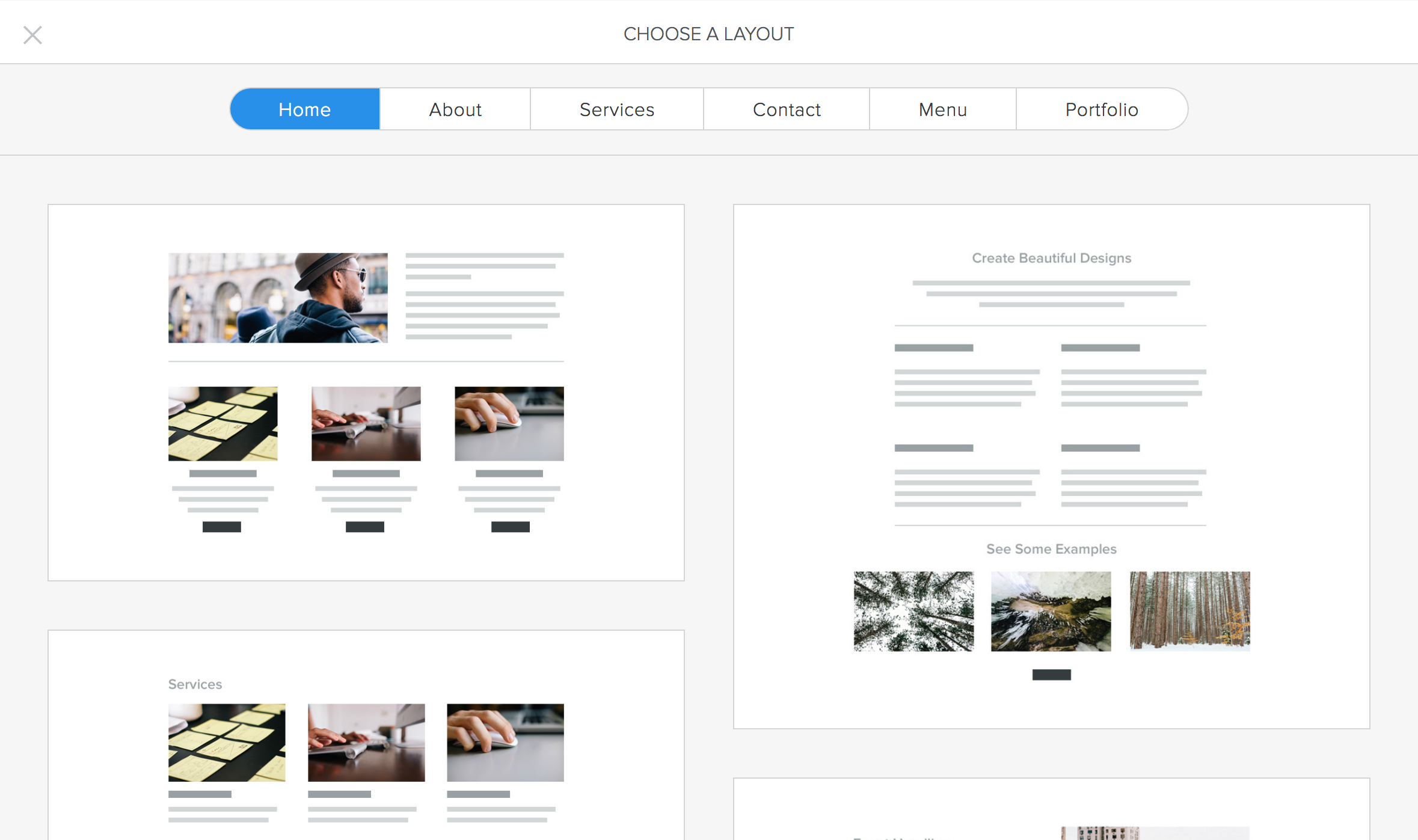 Besides choosing your theme, Weebly also gives you the ability to select from different page layouts for any of the pages on your site by clicking on Start with a Layout and then selecting one of the premade layouts.