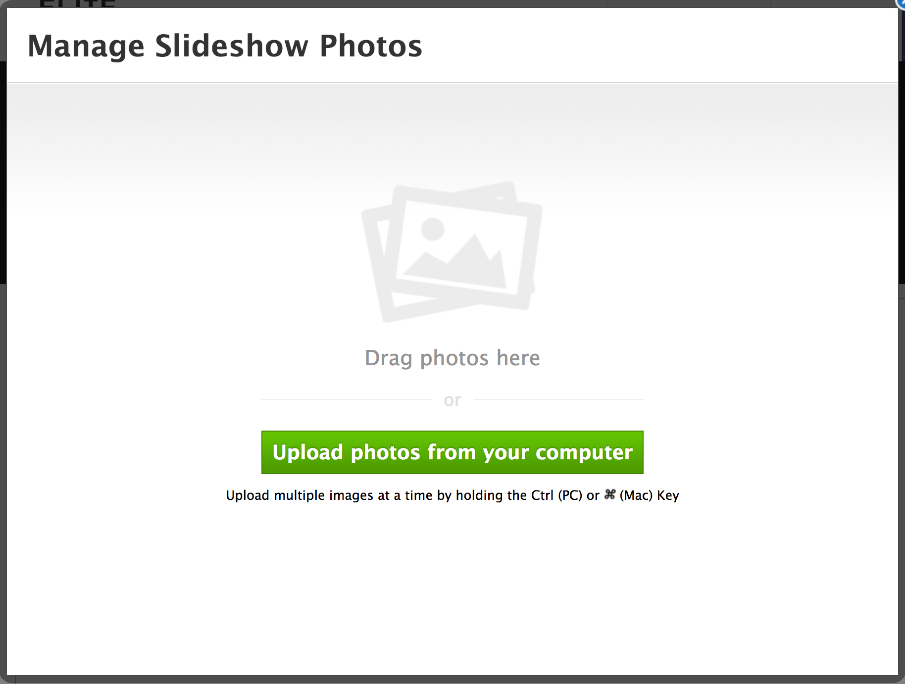 - Once you select the slideshow type, you will be prompted to upload photos. You can either drag and drop your photos from your computer to the dialog box, or you can click the Upload Photos button.