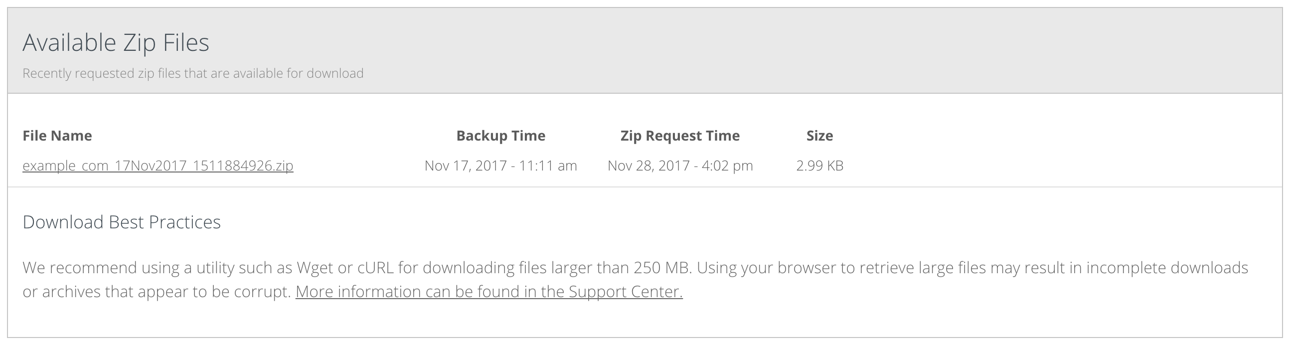 Optionally, users can download full copies of a CodeGuard backup in a single zip file. This could be done instead of deleting old backups to clean up server space. This option is ideal for those wanting to replace files manually or compare the files to see the differences: