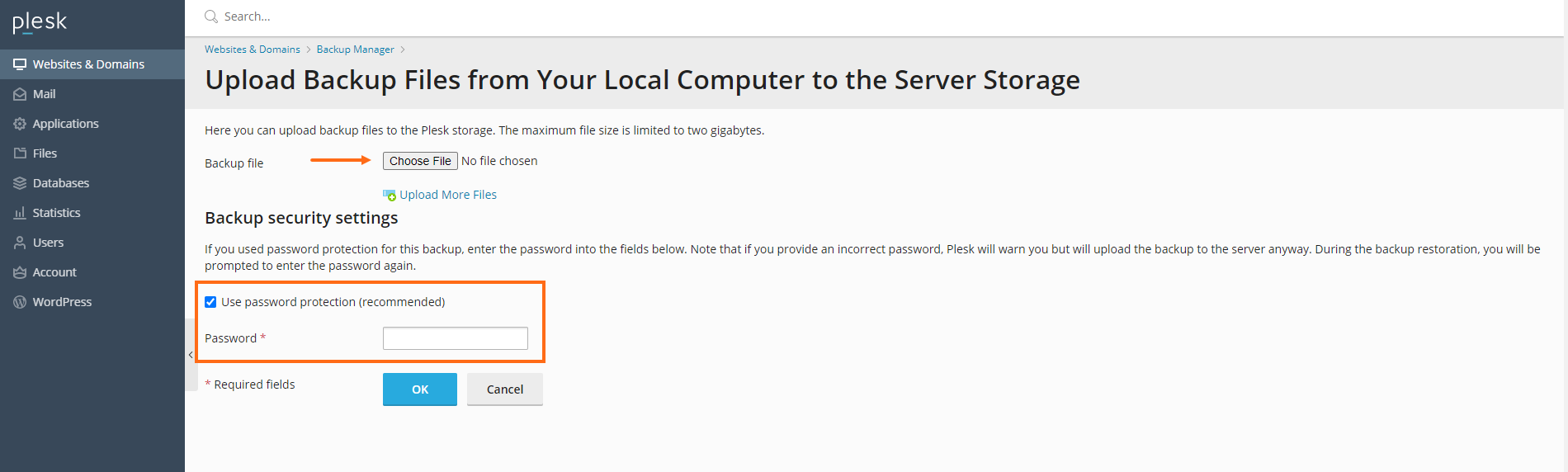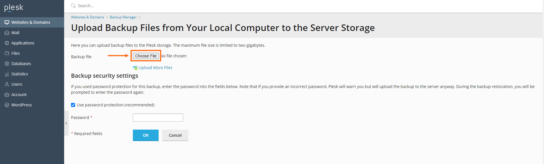Note: The files to be uploaded are only specific to backups generated in Plesk. To upload a file to the Server Storage: